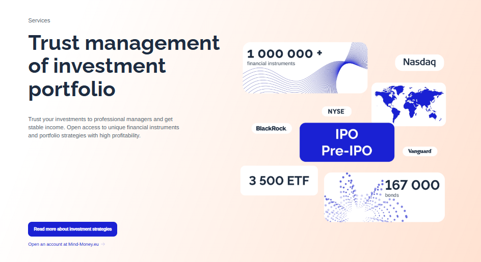 Mind Money — это инвестиционная платформа европейского уровня, ориентированная на обеспеченных клиентов, предпочитающих стратегическое мышление и долгосрочный финансовый подход. Компания предлагает современный сервис, сочетающий надёжность регулирования, техническую устойчивость и персонализированную поддержку.